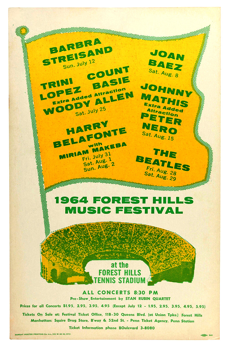 The music festival schedule for the Forest Hills Tennis Stadium in the summer of 1964. Note that Barbra Steisand got a higher ticket price than The Beatles did. The prices for acts other than Streisand were $$1.95 to 4.95. That's $20.22 to $51.34 in current dollars. Not bad.