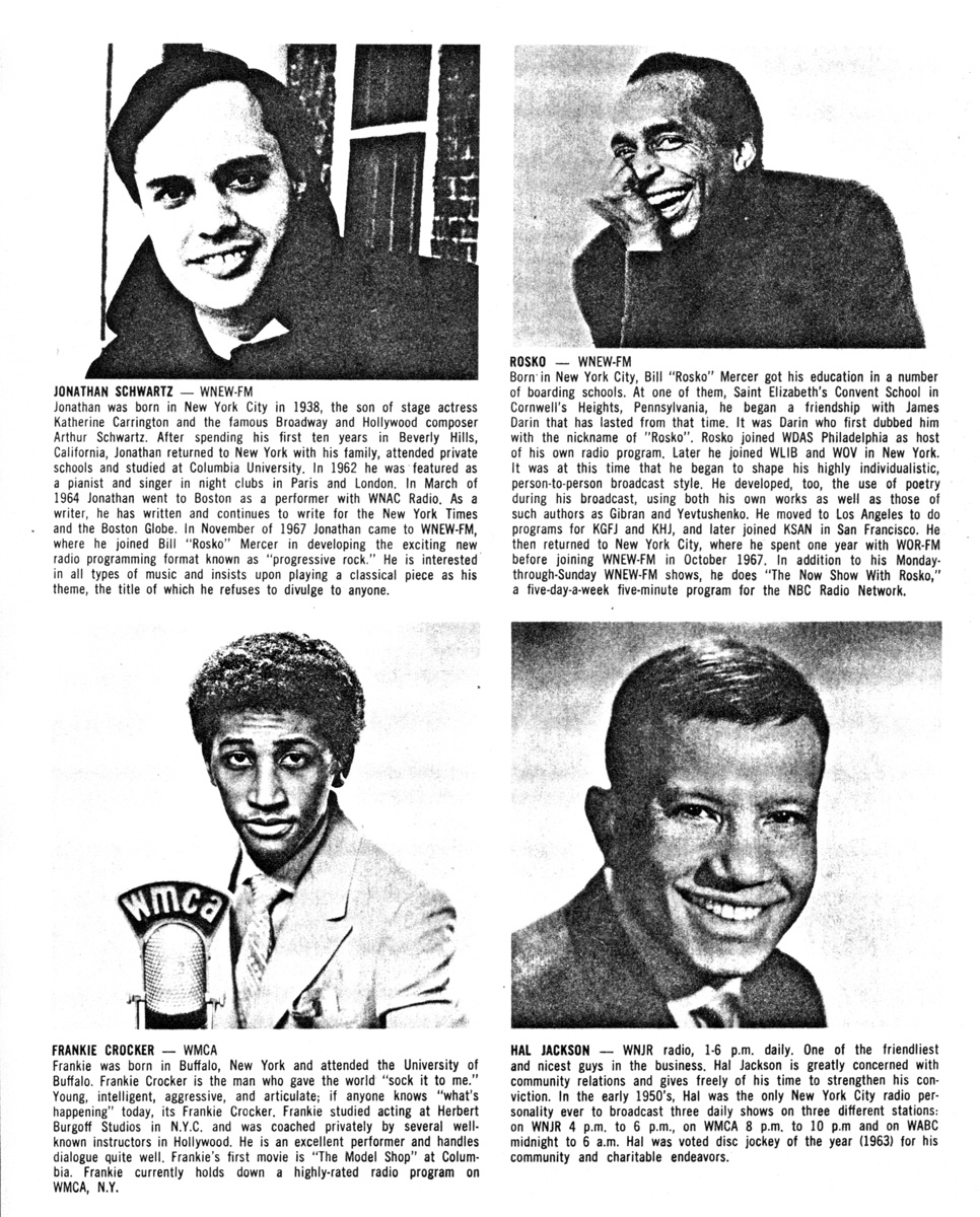 DJ's include: Martin Block, Joe Adams, Joe Allison, Bill Anson, Doug Arthur, Don Bell, Paul Brenner, Bob Clayton, Paul Dixon, Ed Gallagher, Dick Gilbert, Bill Gordon, Maurice Hart, Bruce Hayes, Eddie Hubbard, Bea Kalmus, Lea Malloy, Paul Masterson, Ed McKenzie, Tom Mercein, Gill Newsome, Gene Norman, Art Pallans, Bob Poole, Norm Prescott, Fred Robbins, Ernie Simon, and Larry Wilson