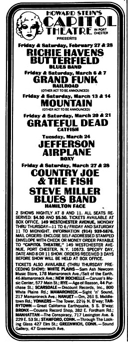 The Capitol tried to do for suburbia what the Fillmore East did for the city. Here's a sample schedule for February and March of 1970. The Capitol has recently been renovated and restored to its original 1920's glory and is once again hosting music shows regularly.