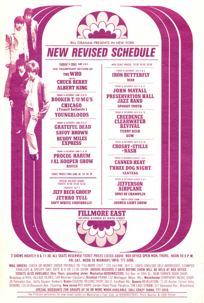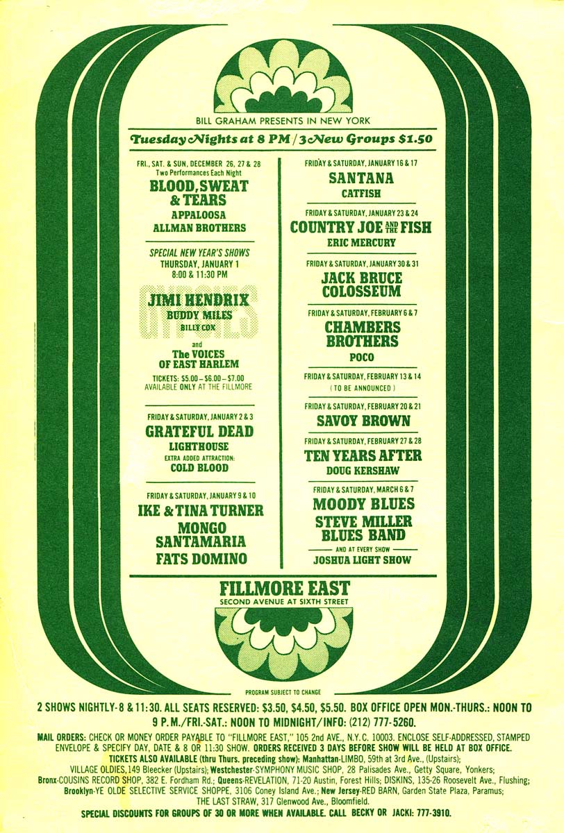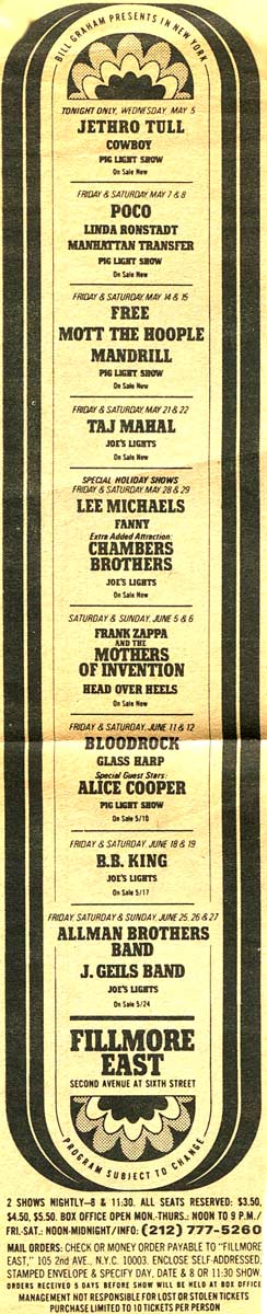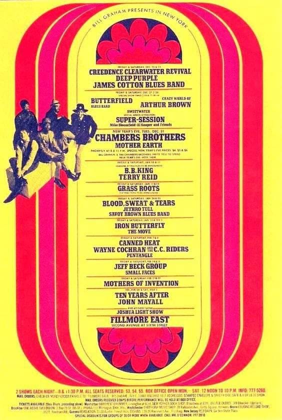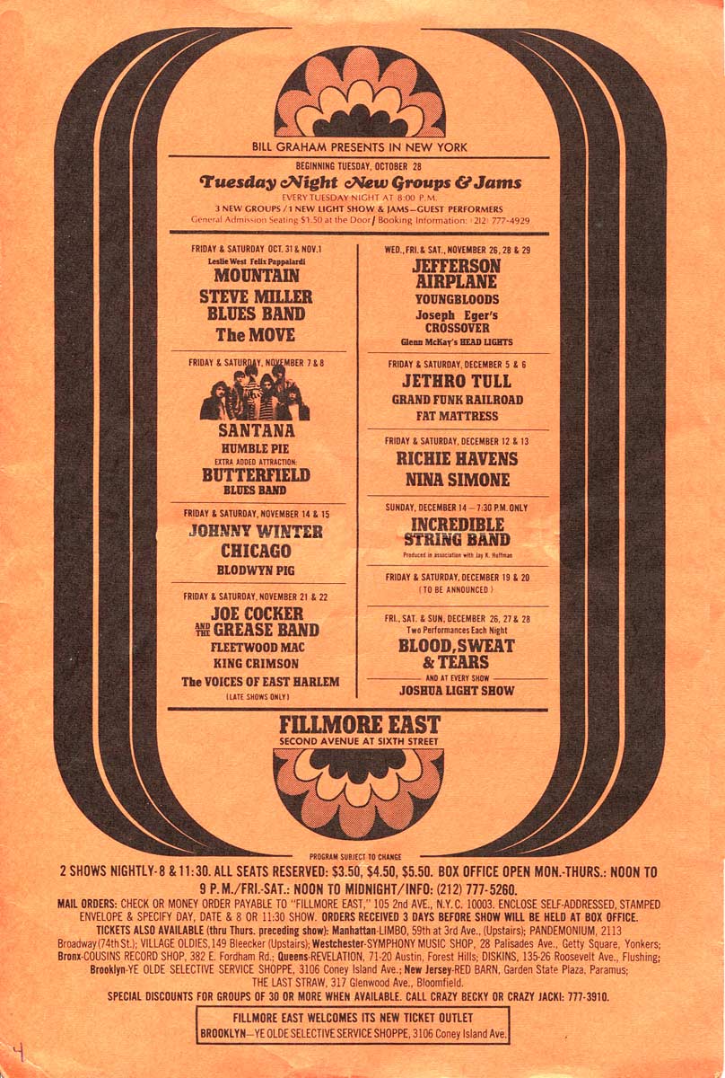Bill Graham's Fillmore East was the New York cathedral of rock & roll. Located on 2nd avenue in the East Village, the venue was formerly a Yiddish theatre and later, the Loew's Commodore movie theater before becoming the Village Theater where some rock concerts were held before officially becoming the 2800 seat Fillmore East. It was the place to hear every important group of the progressive rock era. While frequently criticized at the time by those who thought that "music should be free" (nothing changes), he actually provided incredible value: tickets initally at $3, $4 and $5 and later at $3.50, $4.50 and $5.50 ($23 to $36 in 2015 dollars), one could see up to three great acts and a light show. It was only open a bit over three years, but it was incredibly important and influential.