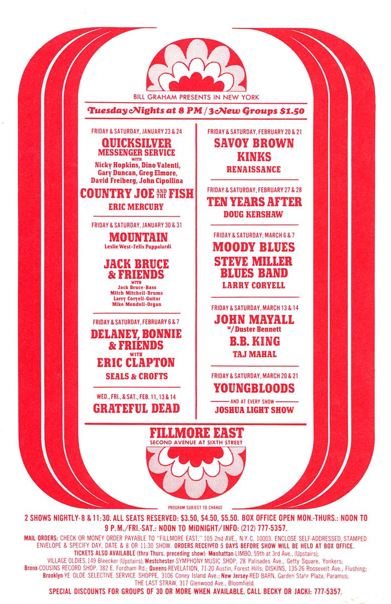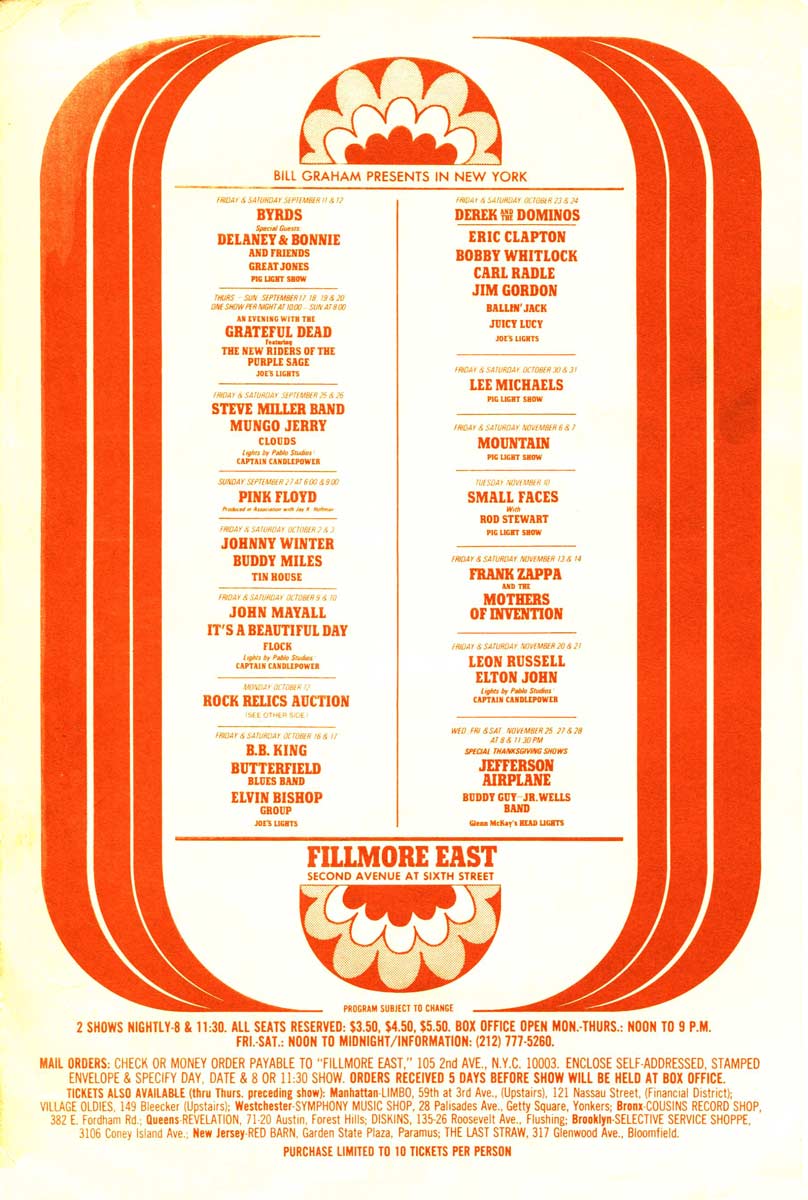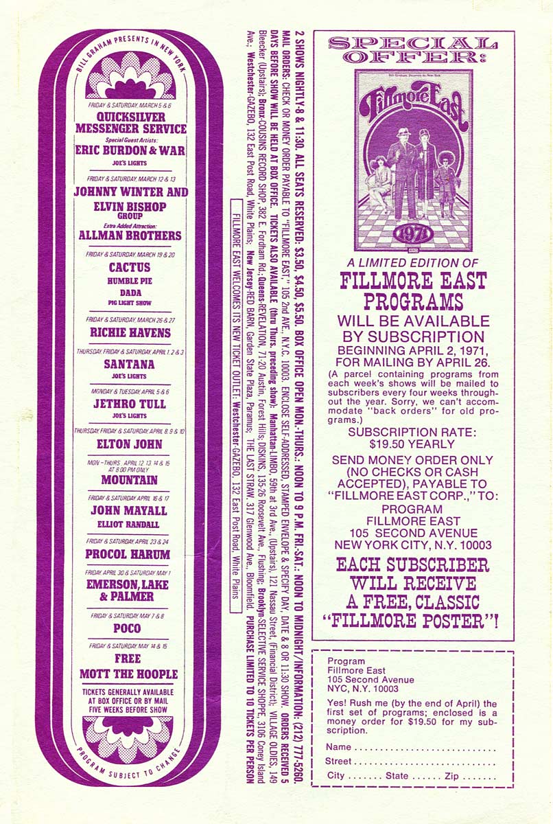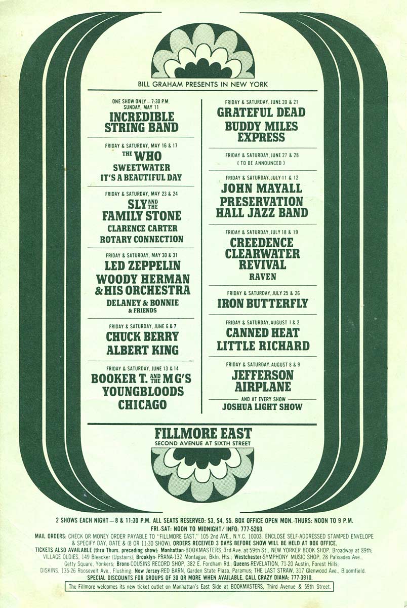 Bill Graham's Fillmore East was the New York cathedral of rock & roll. Located on 2nd avenue in the East Village, the venue was formerly a Yiddish theatre and later, the Loew's Commodore movie theater before becoming the Village Theater where some rock concerts were held before officially becoming the 2800 seat Fillmore East. It was the place to hear every important group of the progressive rock era. While frequently criticized at the time by those who thought that "music should be free" (nothing changes), he actually provided incredible value: tickets initally at $3, $4 and $5 and later at $3.50, $4.50 and $5.50 ($23 to $36 in 2015 dollars), one could see up to three great acts and a light show. It was only open a bit over three years, but it was incredibly important and influential.