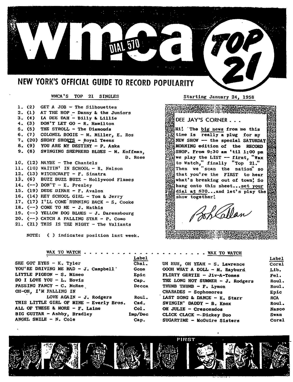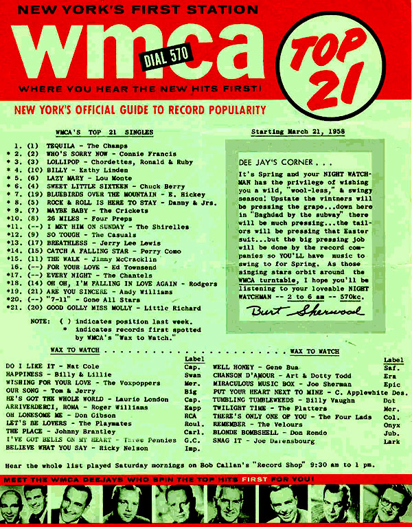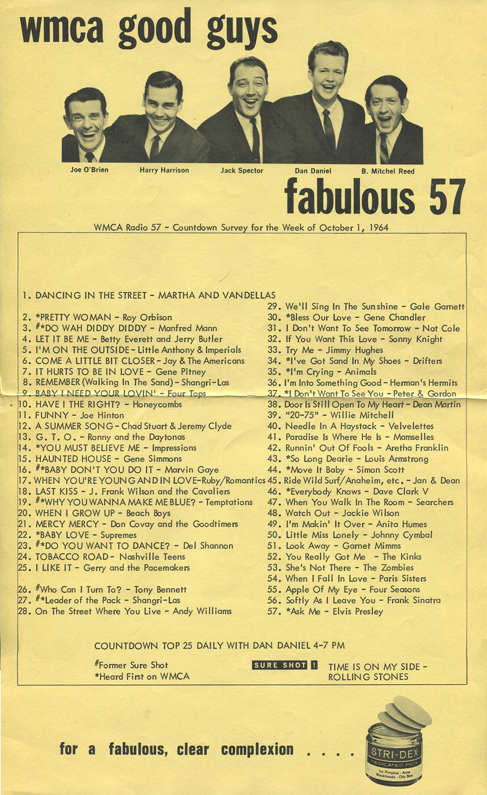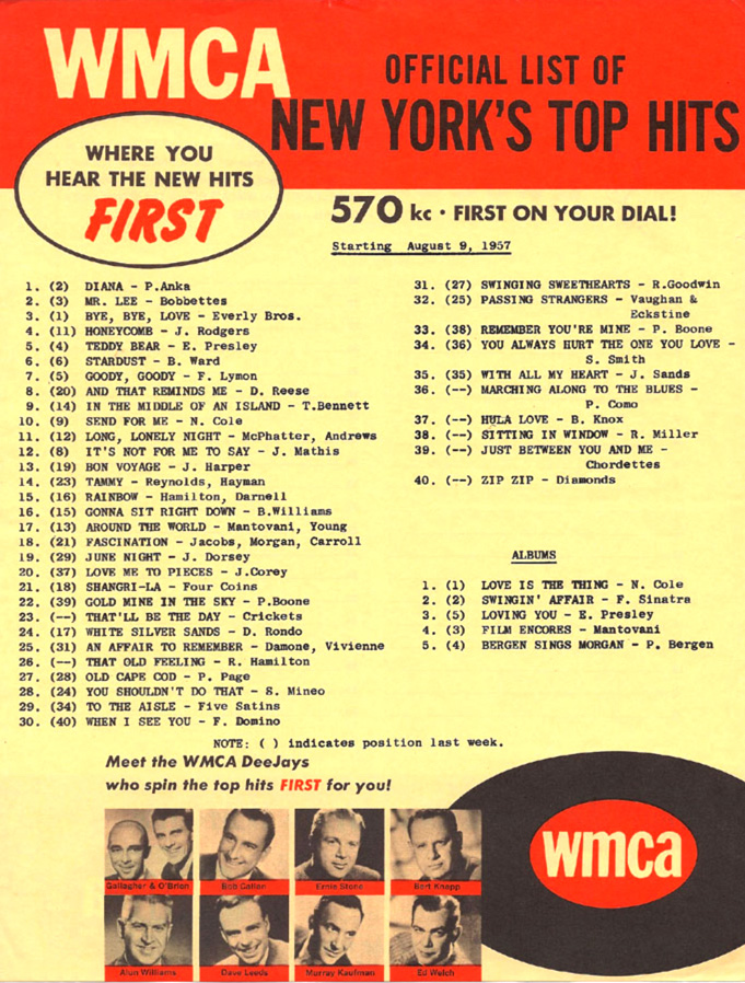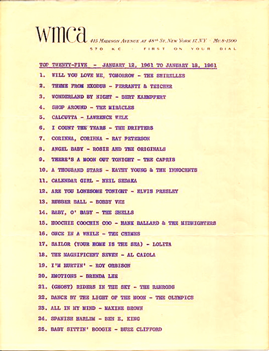 The WMCA survey from May 5, 1960 still includes some pop (Steve Lawrence, Nat King Cole, Connie Francis, etc.), but also includes some actual rock and roll via Elvis, Jackie Wilson, Conway Twitty, Brook Benton, Dion and the Belmonts, Fats Domino and Lloyd Price.