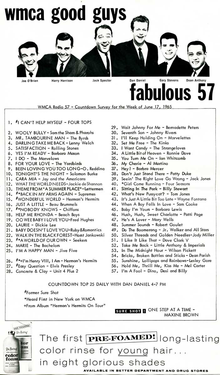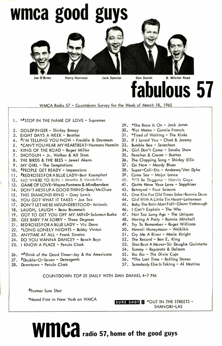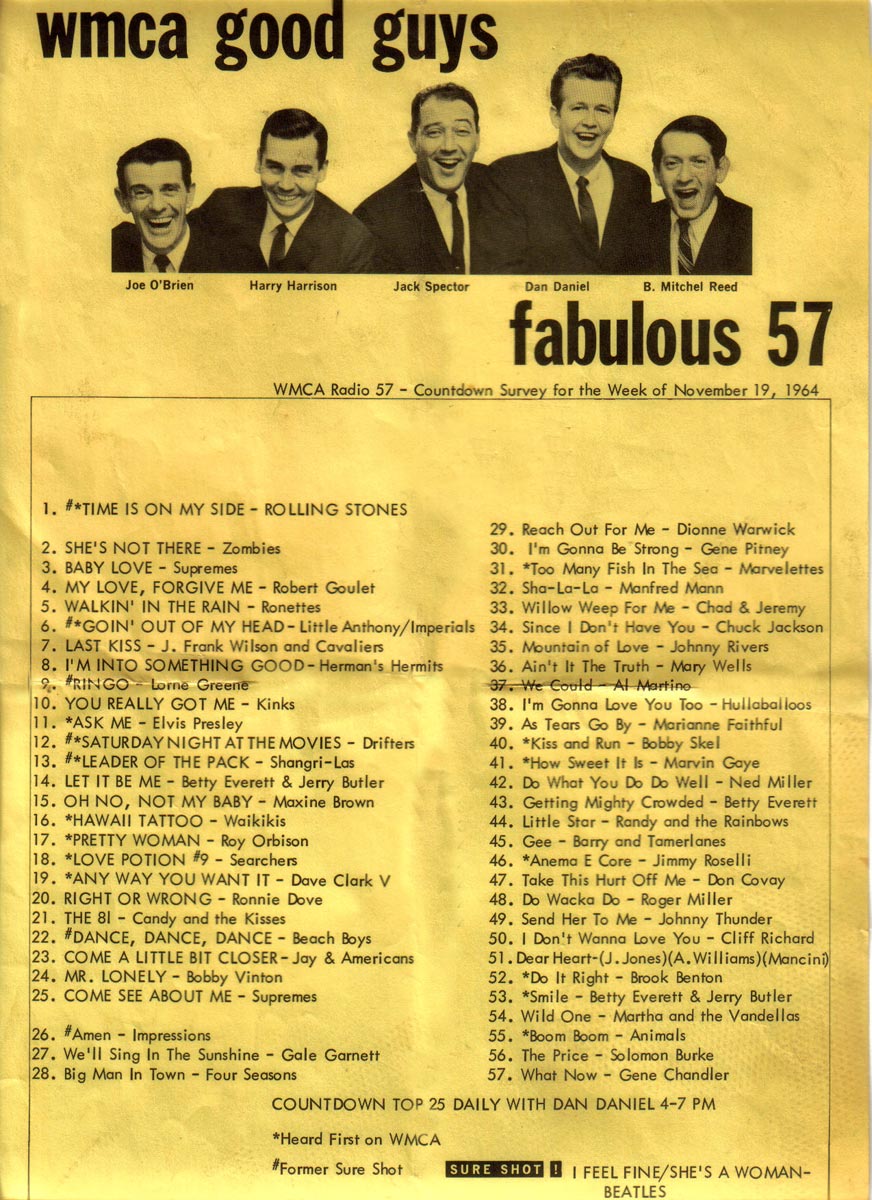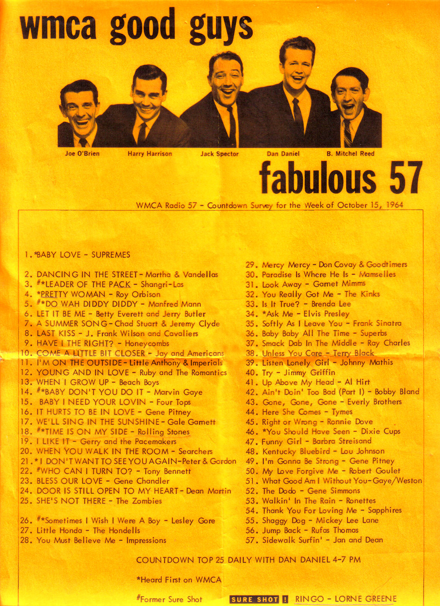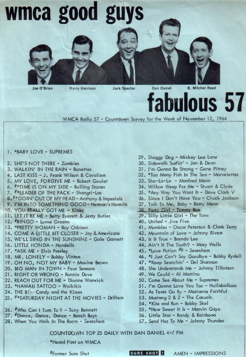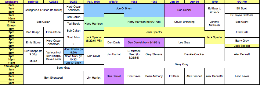 This is the air schedule for the top-40 era on WMCA. This is sourced from newspapers, FM Guide (which was usually a few months behind changes), Radio Guide, Richard Neer's book on FM radio, personal recollections of myself and DJs and various postings on the web, especially those of Vince Santarelli and Rock Radio Scrapbook. Corrections welcomed. In some cases, the same dates are posted twice due to conflicting information from different sources.
