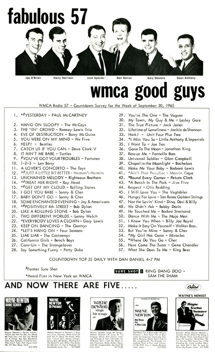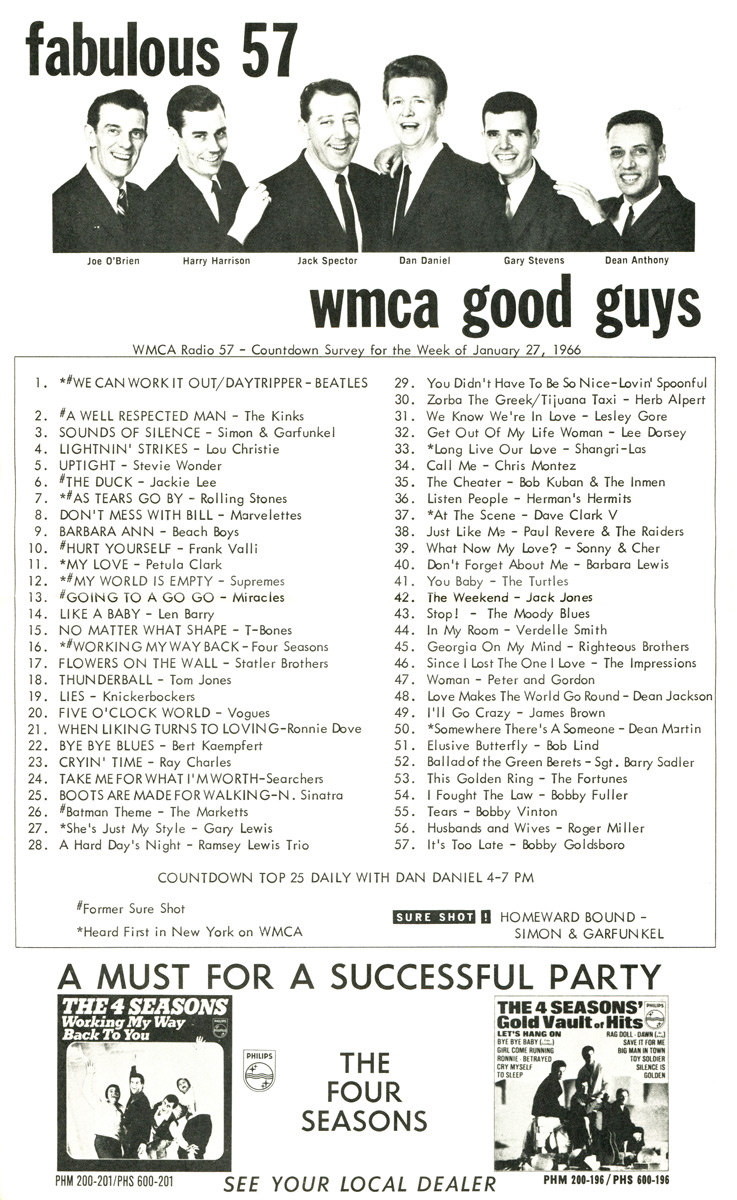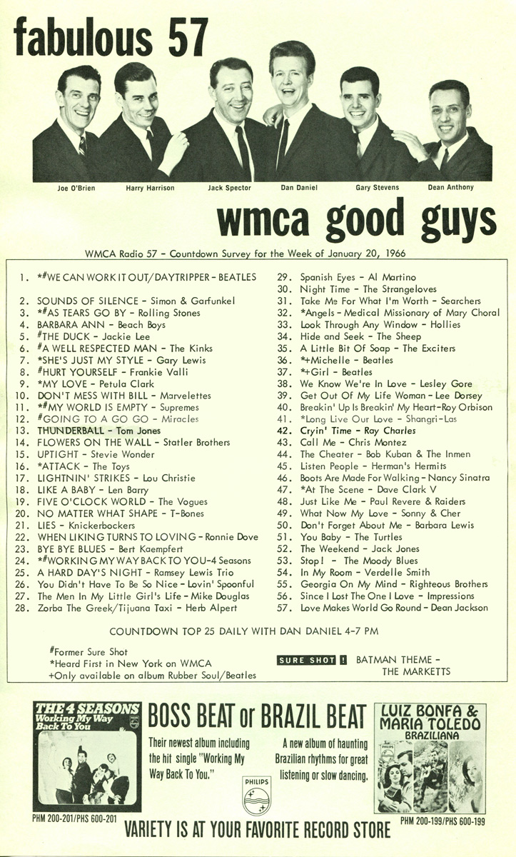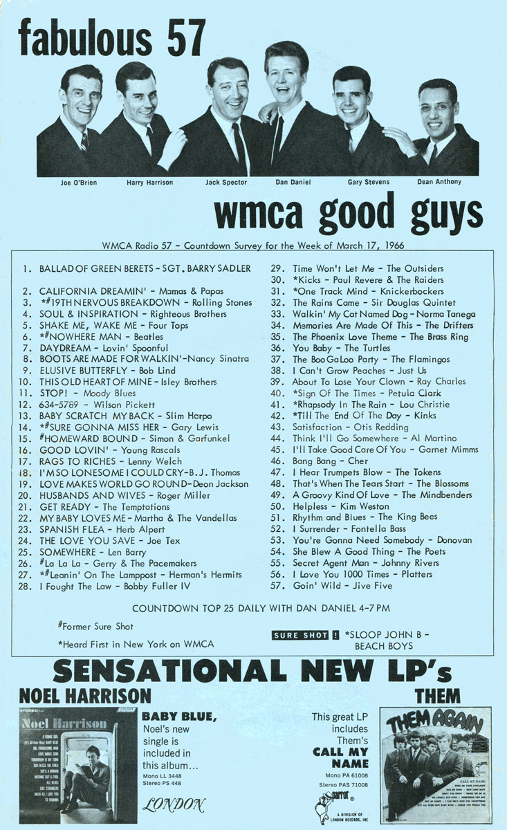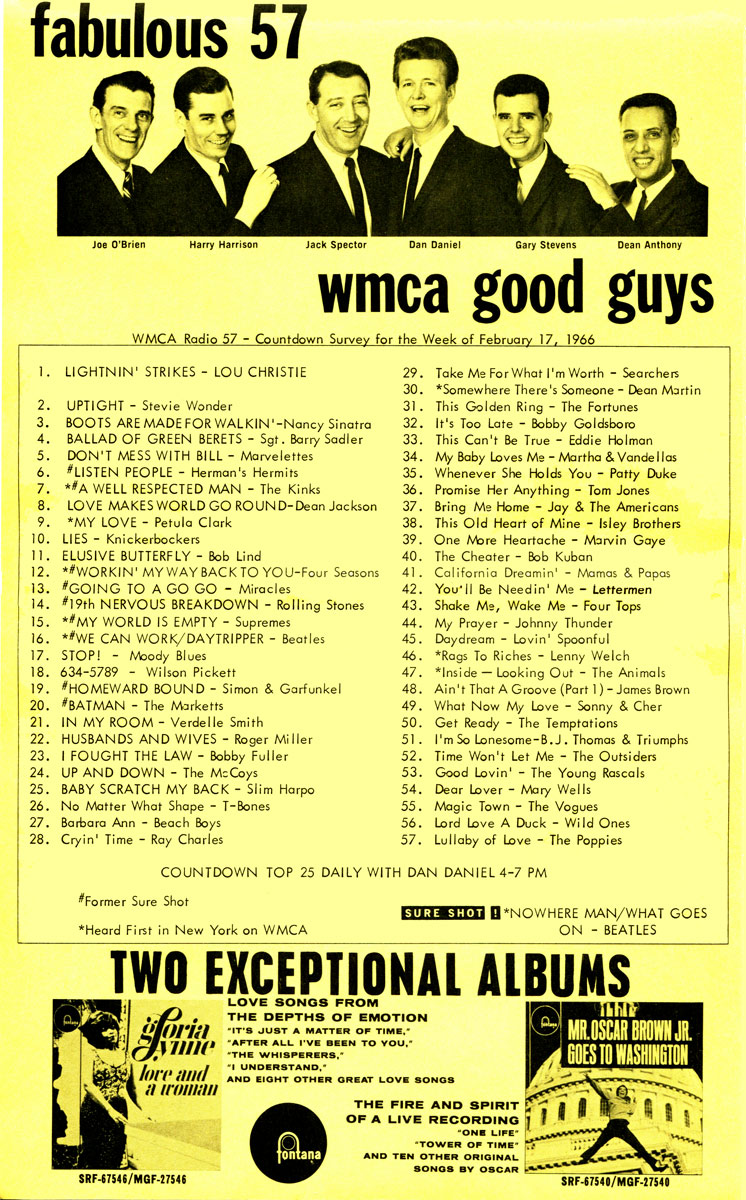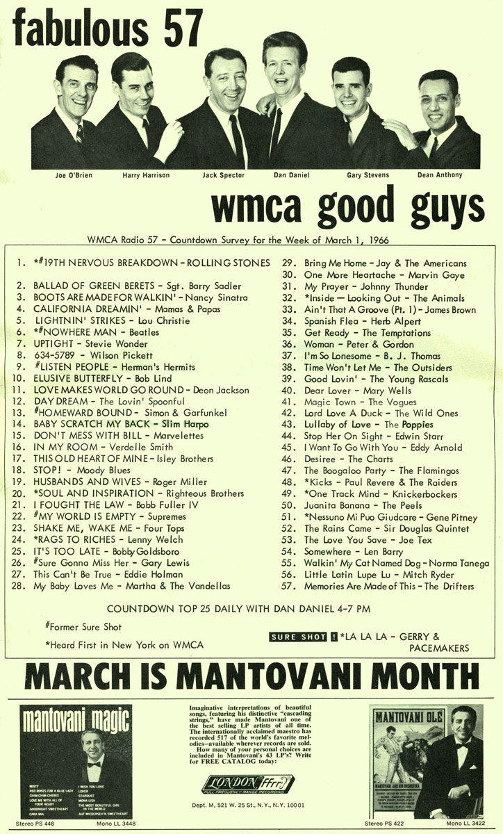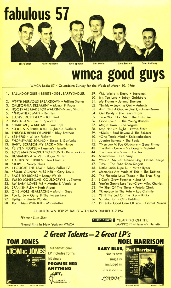 Scott Muni started in NYC at WMCA in June of 1958. He joined WABC when it became a Top-40 station in December of 1960, but left January 29, 1965 and ran a bar in midtown called "The Rolling Stone". He'd later claim that he was not interested in returning to radio. But here he is back as a fill-in on WMCA. 14 months later in October of 1966, he would join WOR-FM and in December of 1967 he would join WNEW-FM where he would reside for over 30 years.