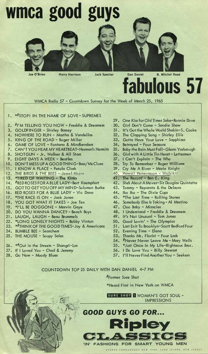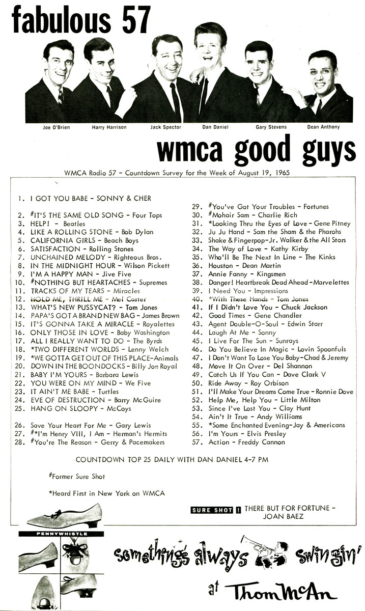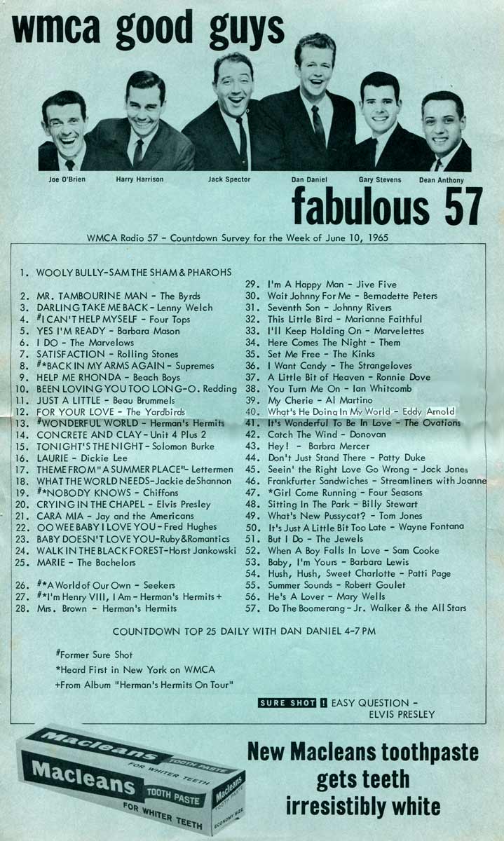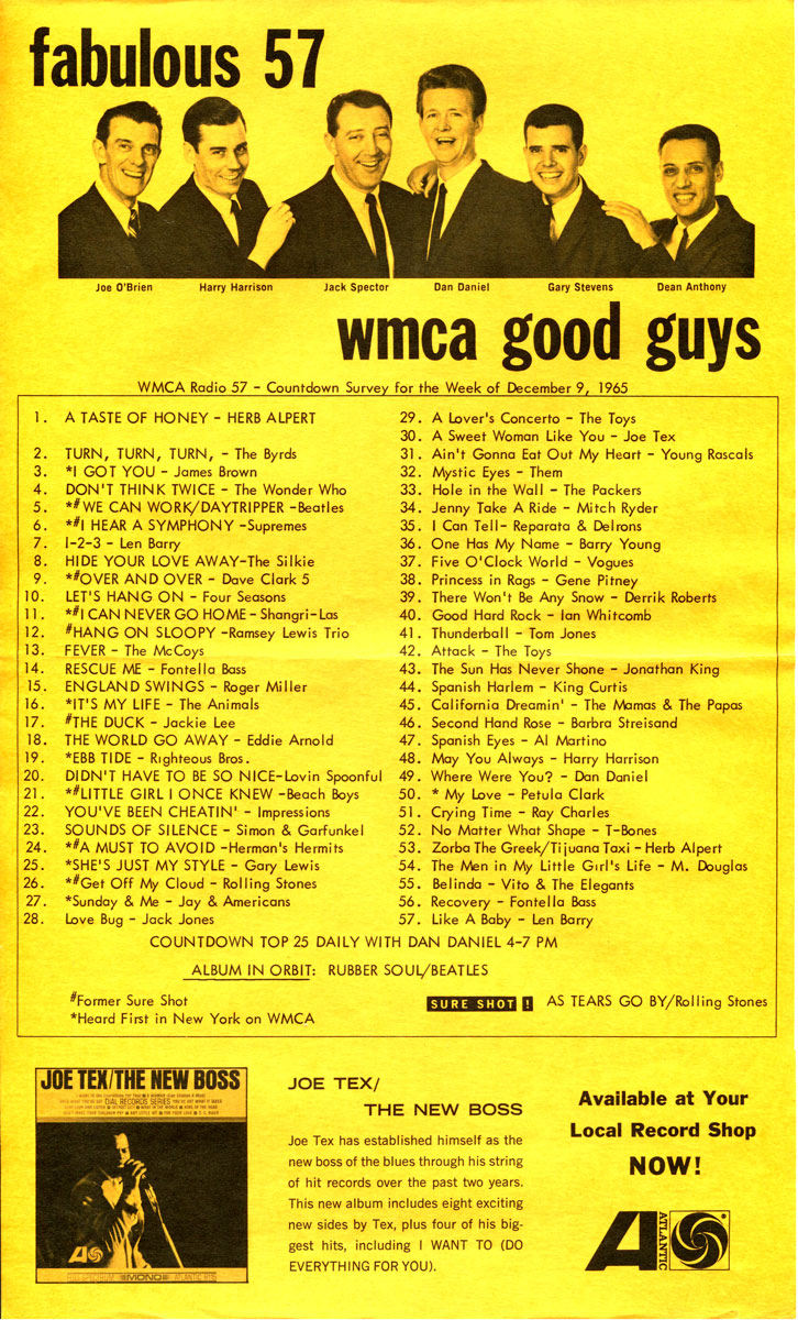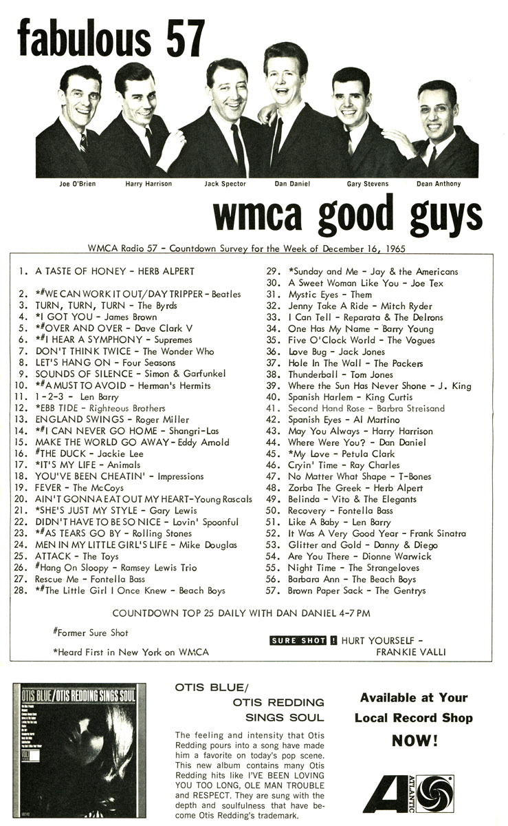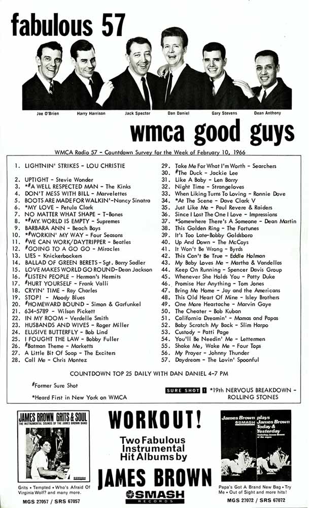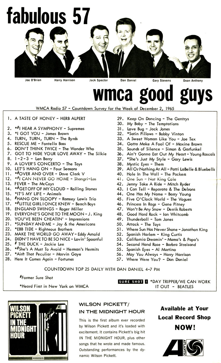 Scott Muni started in NYC at WMCA in June of 1958. He joined WABC when it became a Top-40 station in December of 1960, but left January 29, 1965 and ran a bar in midtown called "The Rolling Stone". He'd later claim that he was not interested in returning to radio. But here he is back as a fill-in on WMCA. 14 months later in October of 1966, he would join WOR-FM and in December of 1967 he would join WNEW-FM where he would reside for over 30 years.