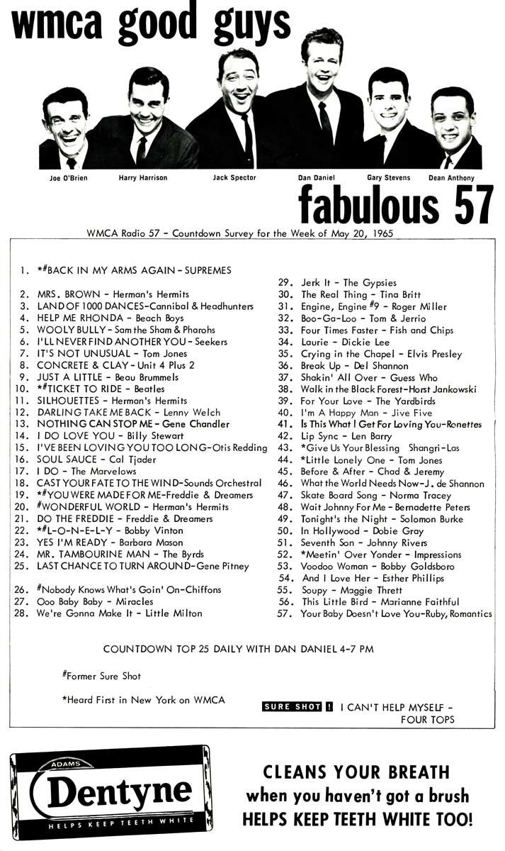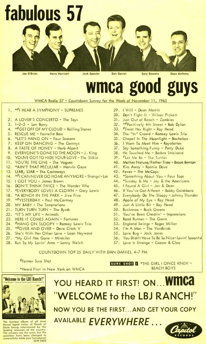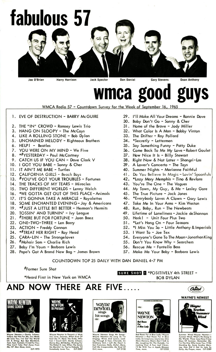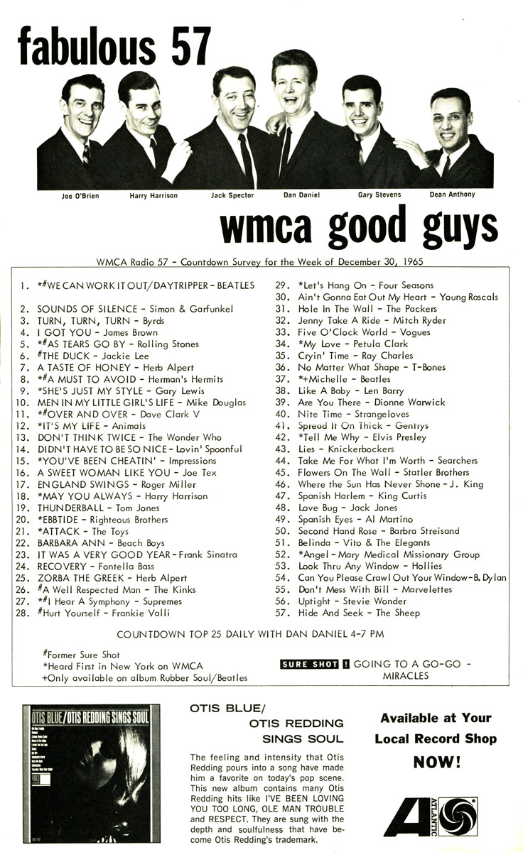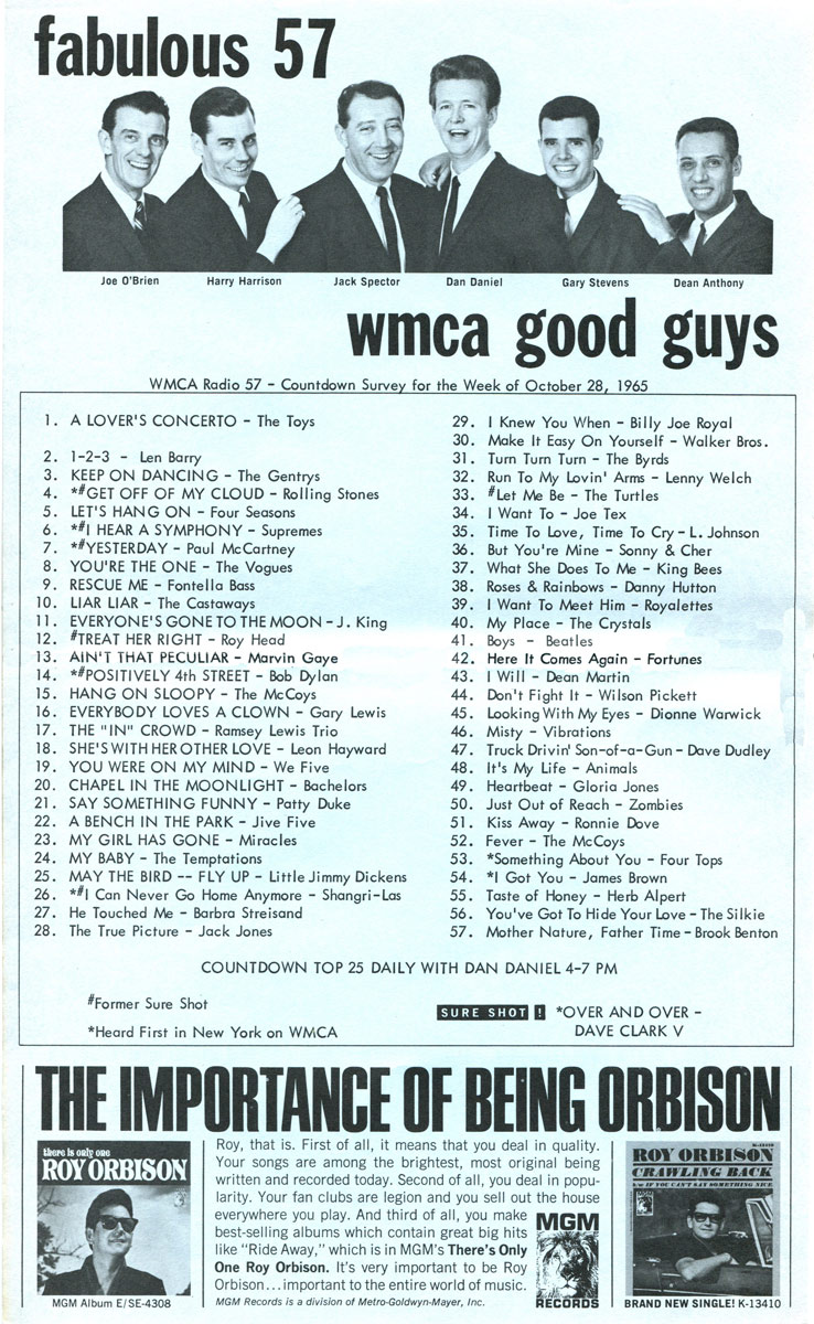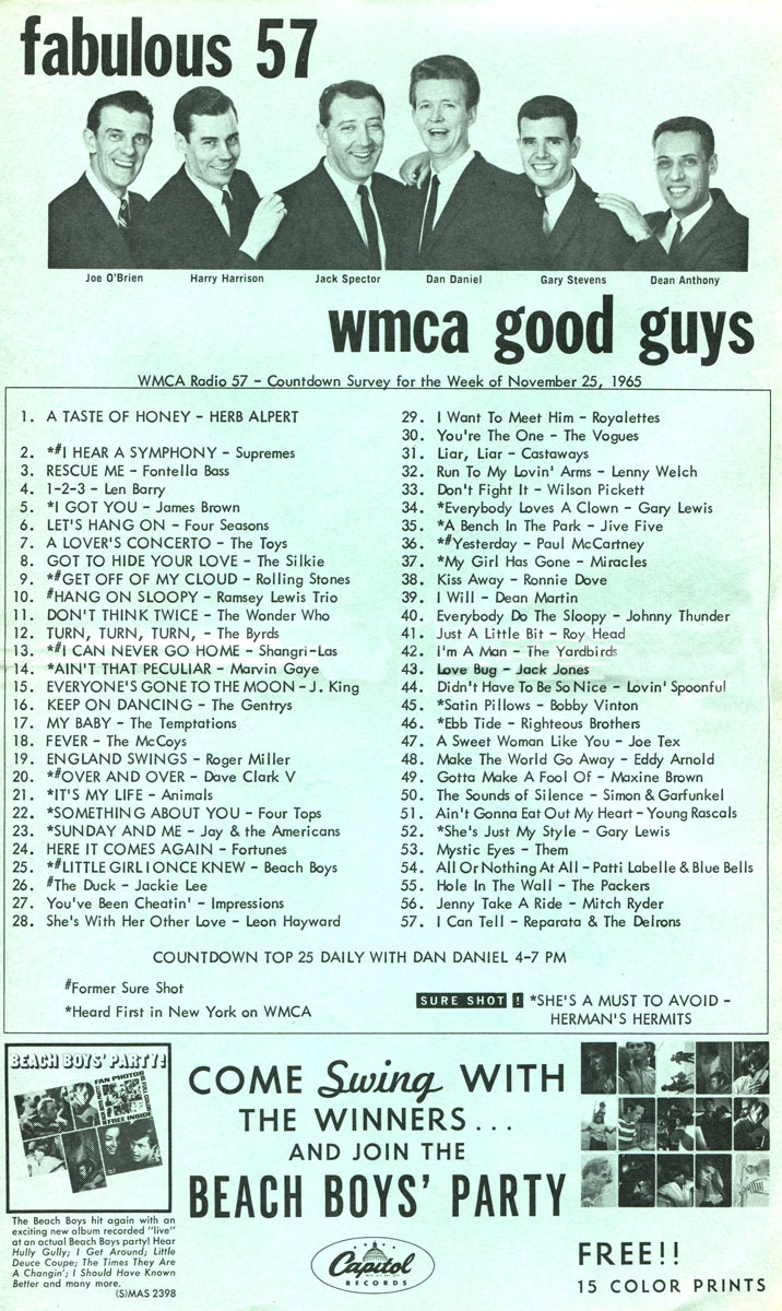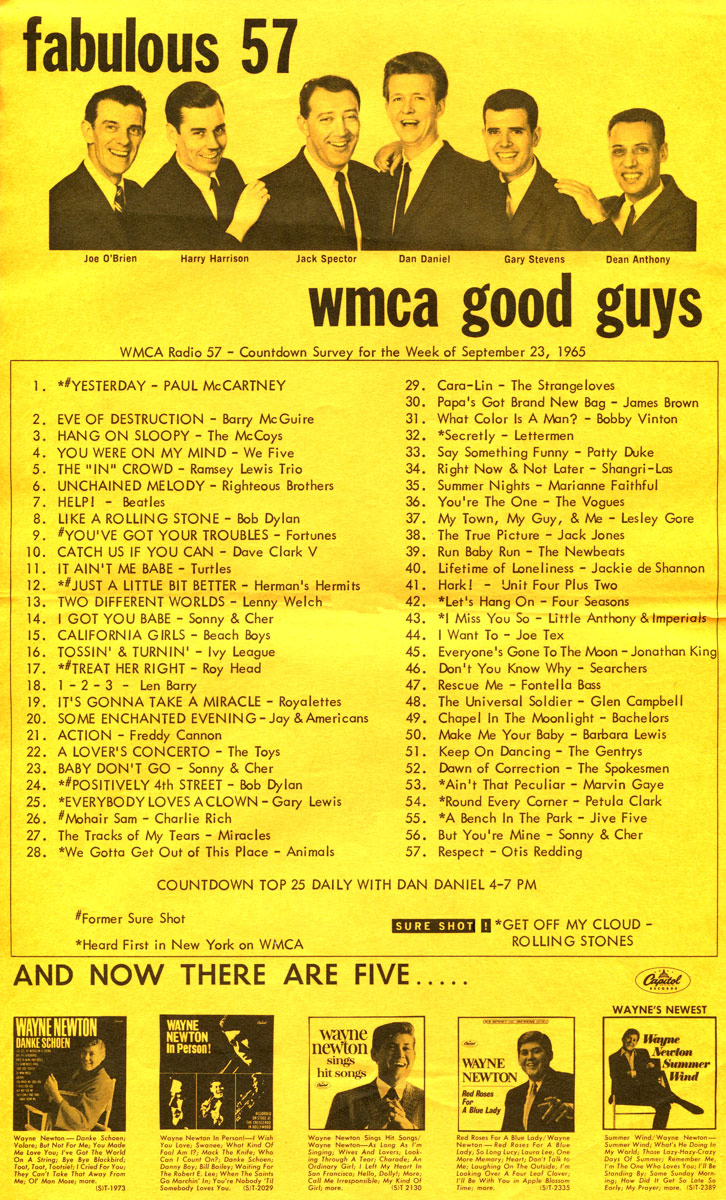 Scott Muni started in NYC at WMCA in June of 1958. He joined WABC when it became a Top-40 station in December of 1960, but left January 29, 1965 and ran a bar in midtown called "The Rolling Stone". He'd later claim that he was not interested in returning to radio. But here he is back as a fill-in on WMCA. 14 months later in October of 1966, he would join WOR-FM and in December of 1967 he would join WNEW-FM where he would reside for over 30 years.