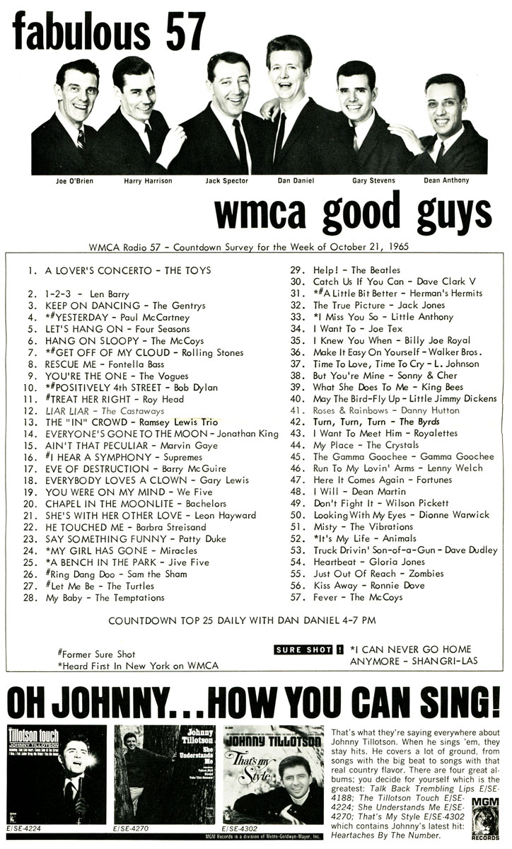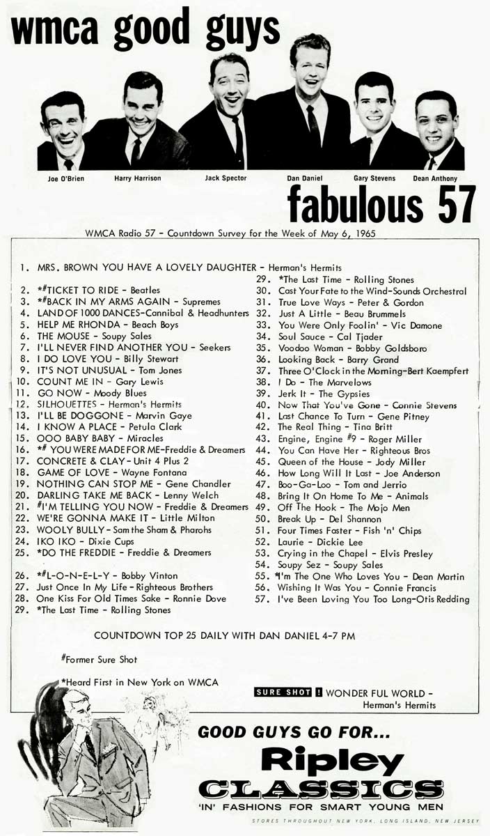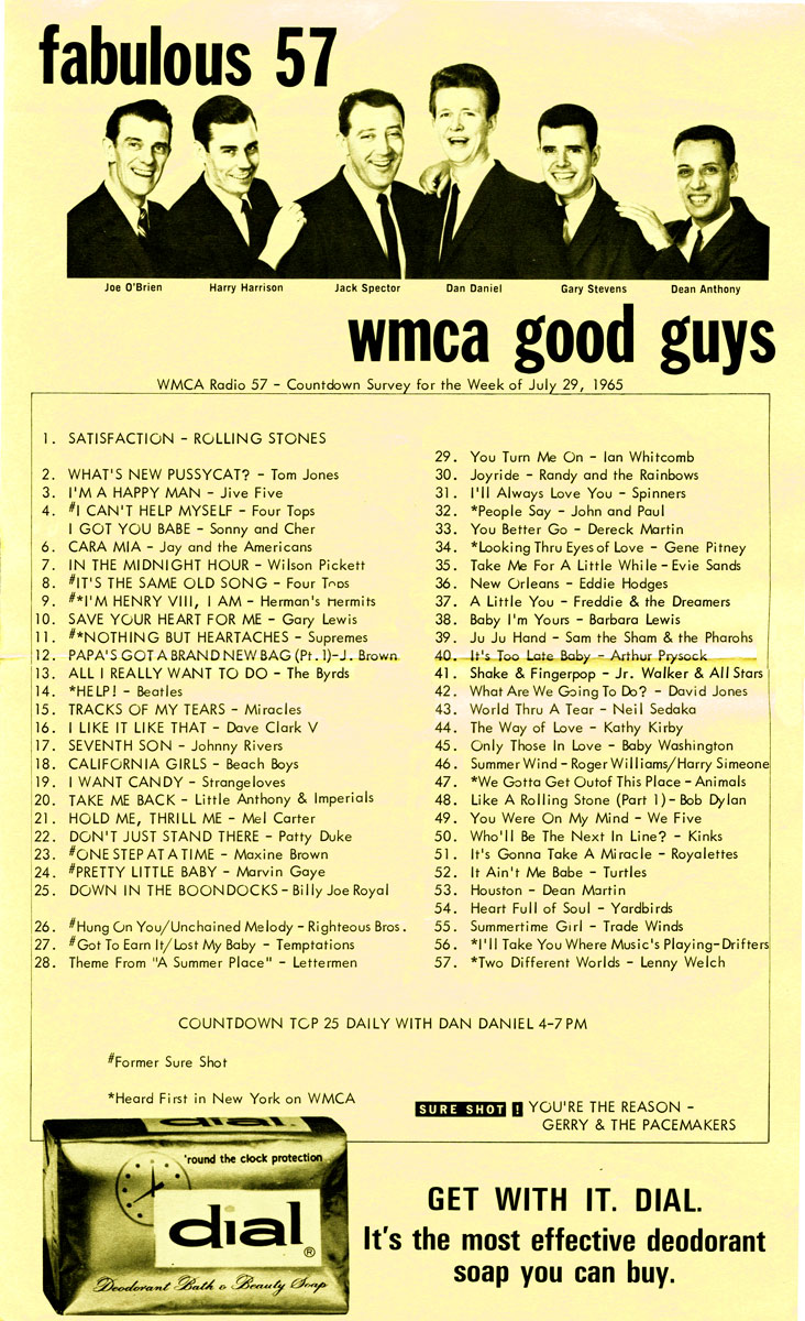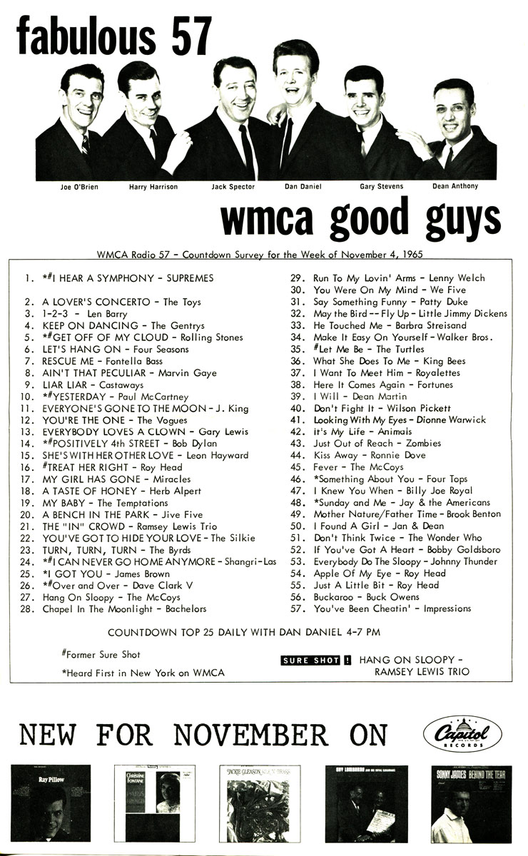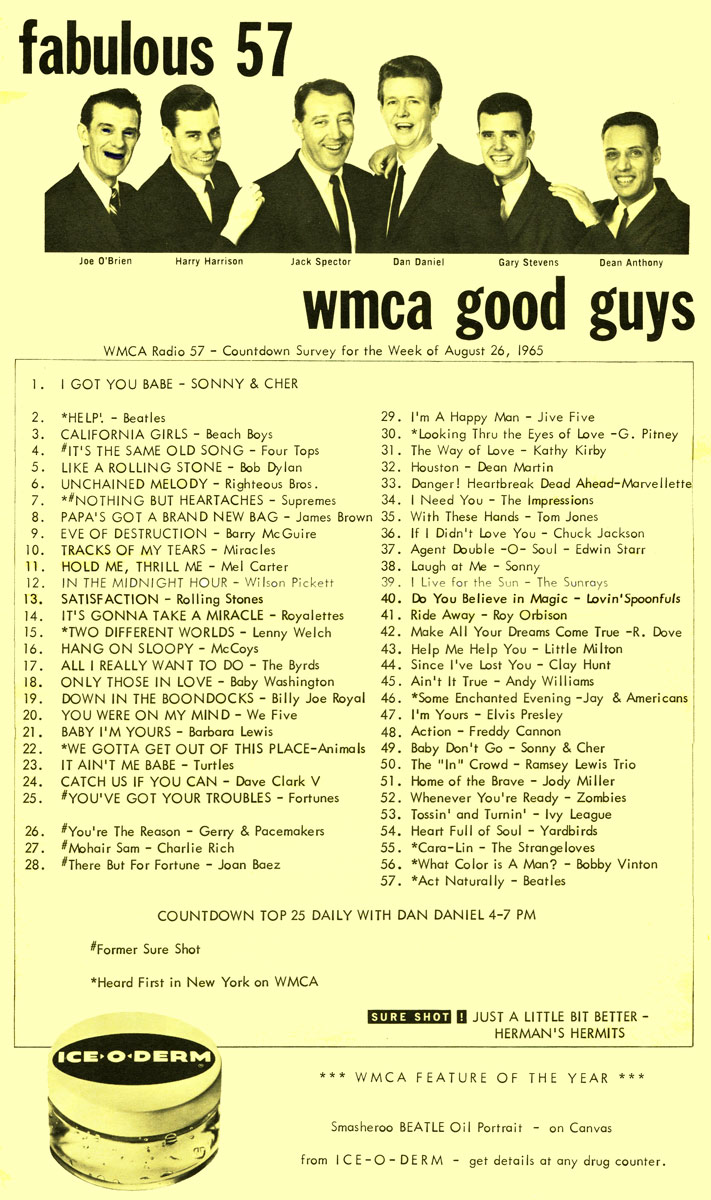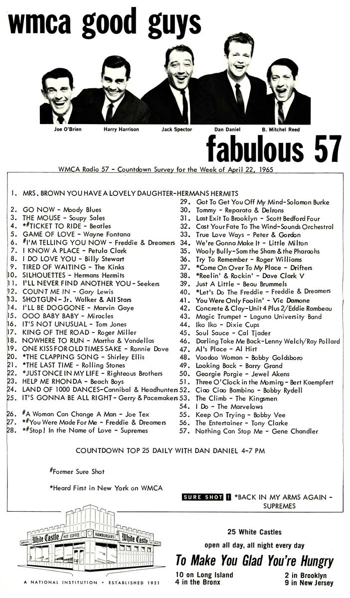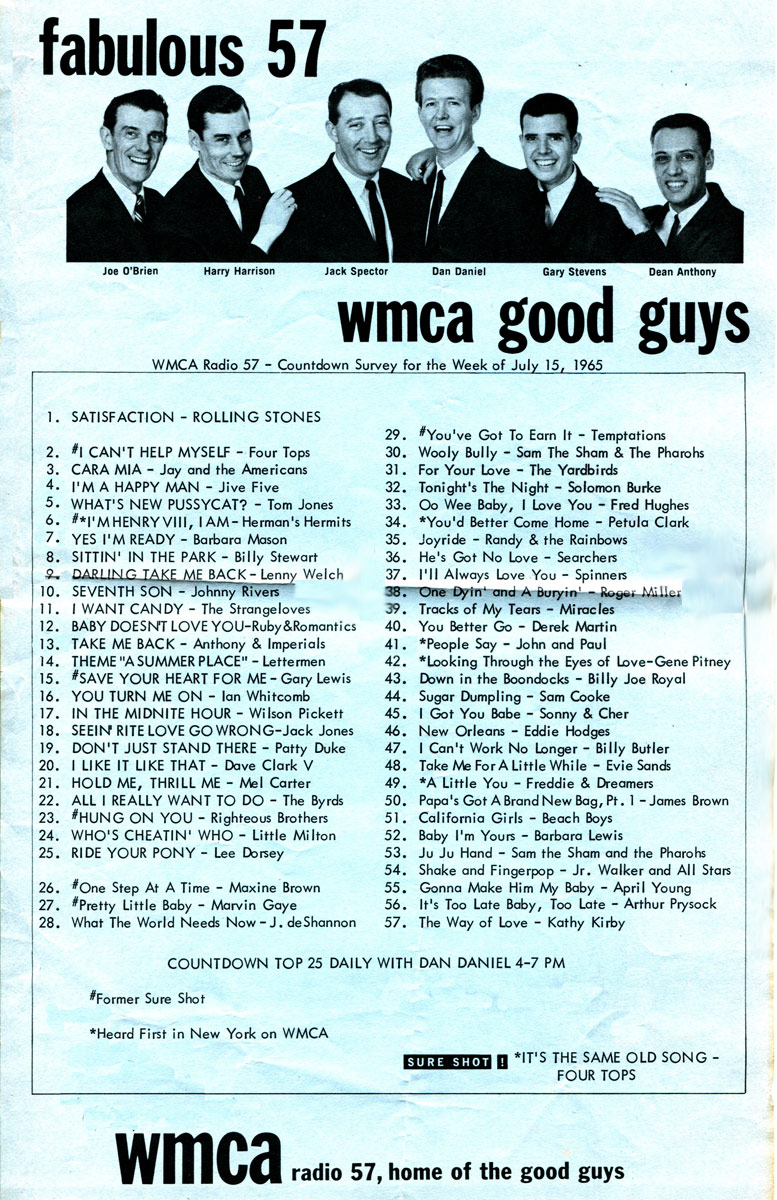 Scott Muni started in NYC at WMCA in June of 1958. He joined WABC when it became a Top-40 station in December of 1960, but left January 29, 1965 and ran a bar in midtown called "The Rolling Stone". He'd later claim that he was not interested in returning to radio. But here he is back as a fill-in on WMCA. 14 months later in October of 1966, he would join WOR-FM and in December of 1967 he would join WNEW-FM where he would reside for over 30 years.