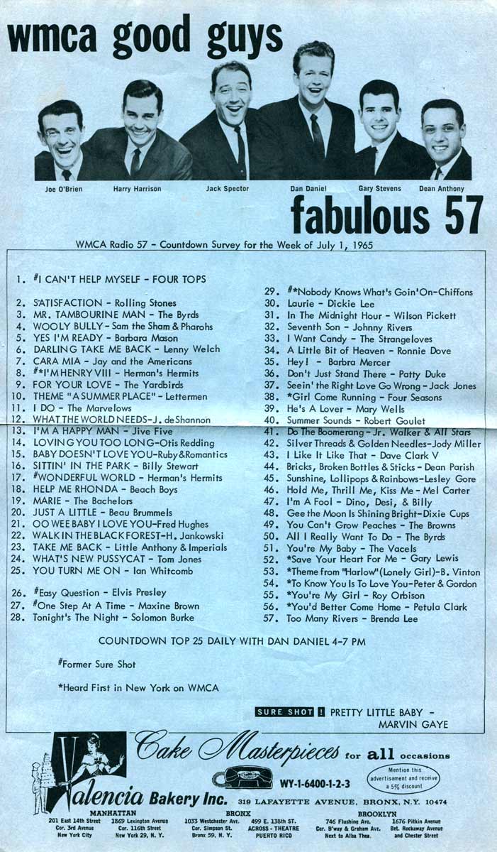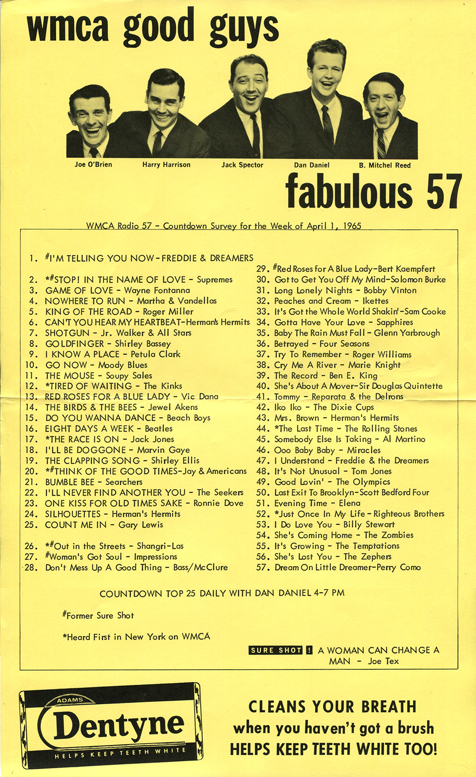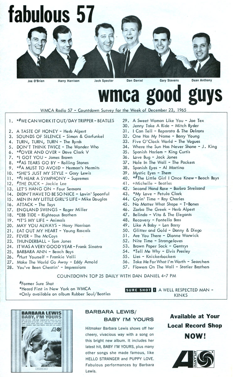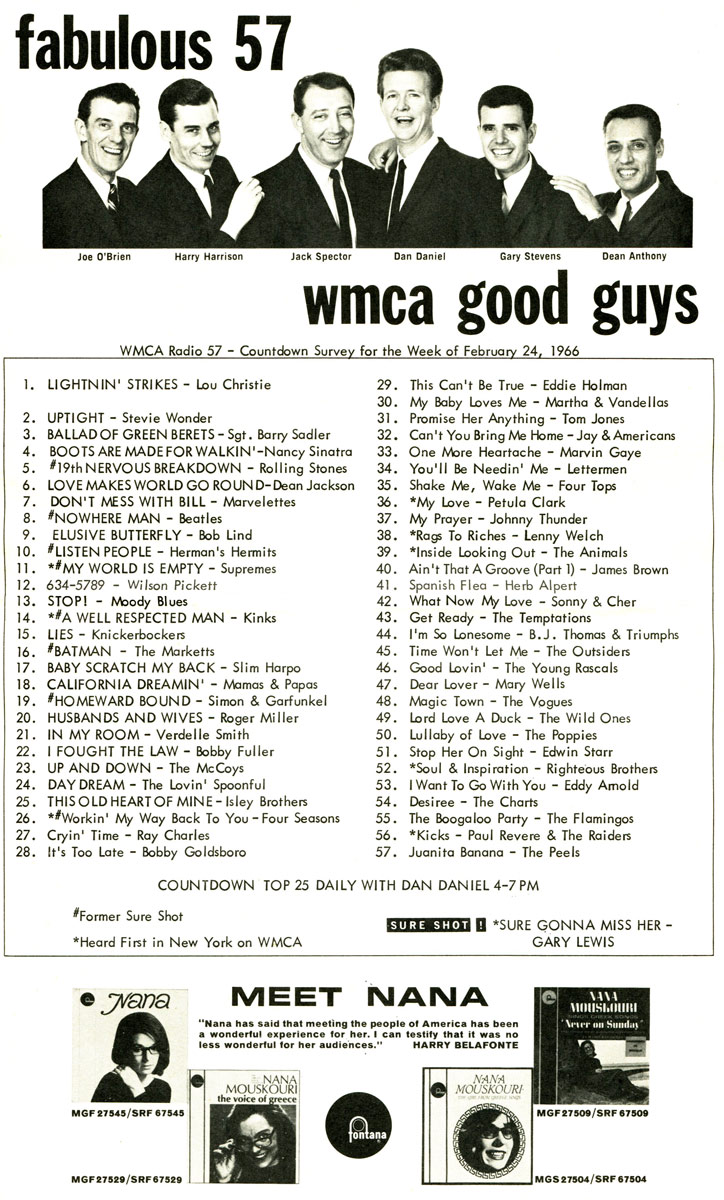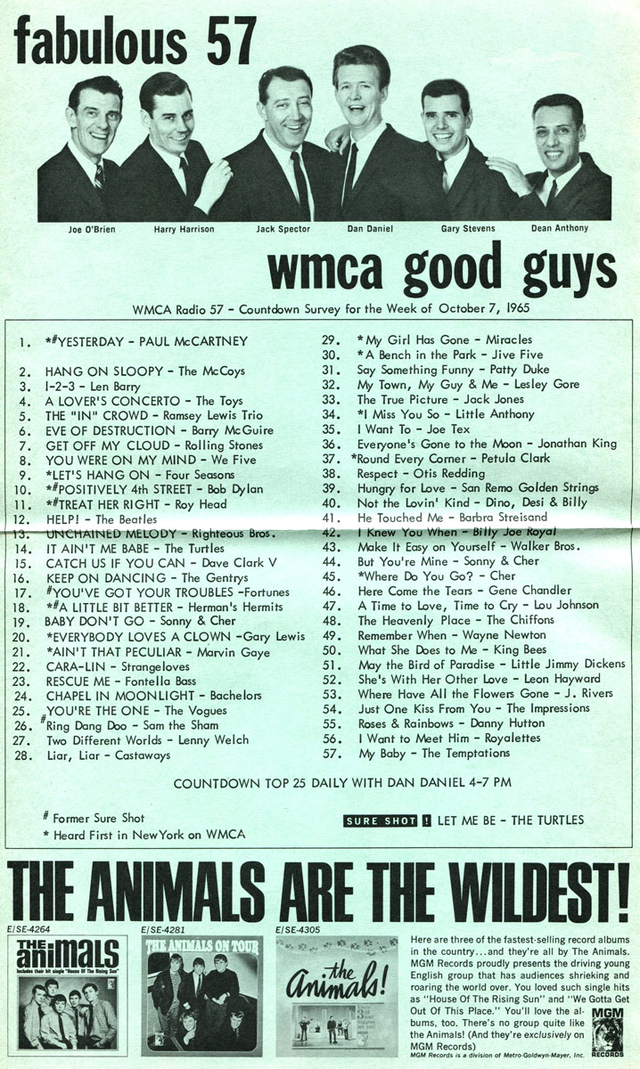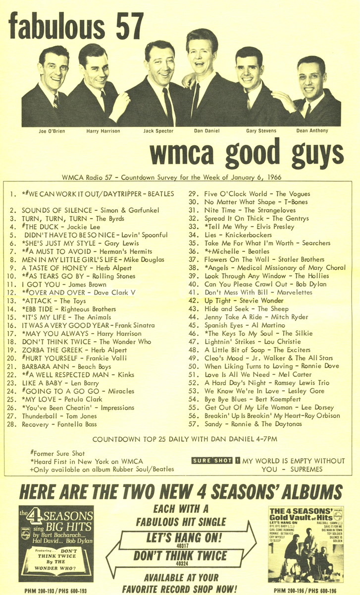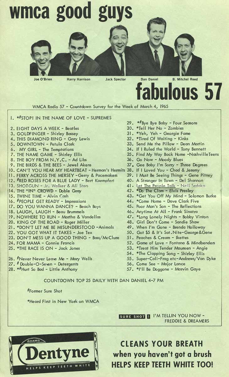 Scott Muni started in NYC at WMCA in June of 1958. He joined WABC when it became a Top-40 station in December of 1960, but left January 29, 1965 and ran a bar in midtown called "The Rolling Stone". He'd later claim that he was not interested in returning to radio. But here he is back as a fill-in on WMCA. 14 months later in October of 1966, he would join WOR-FM and in December of 1967 he would join WNEW-FM where he would reside for over 30 years.