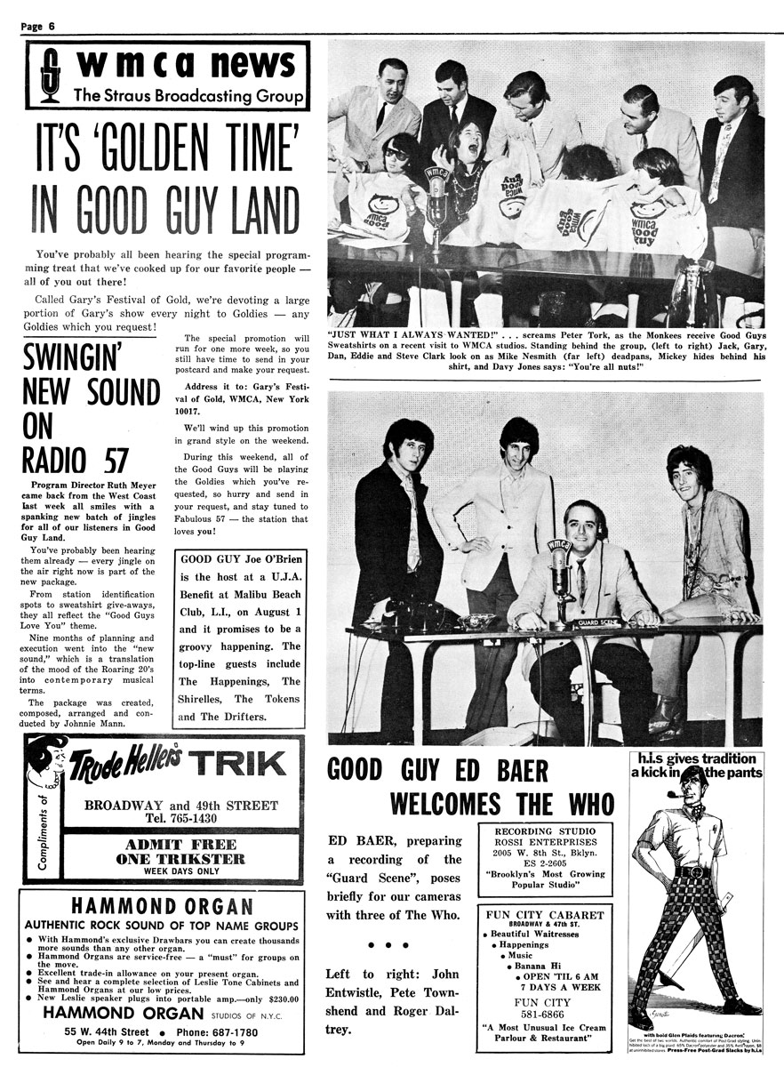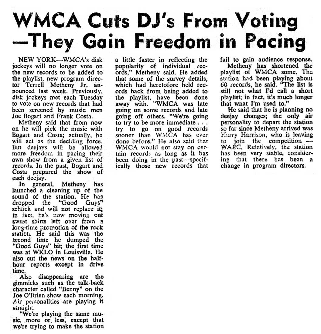 This article describes format changes at WMCA, no doubt influenced by the increasing importance of and competition from FM rock radio. It also announced the end of the "Good Guys" promotion.