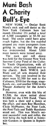 Scott Muni hosts a rock and roll dance at the New York Coliseum. $1.50 per ticket, which is the equivalent of $12.50 in late 2017, not a bad price.