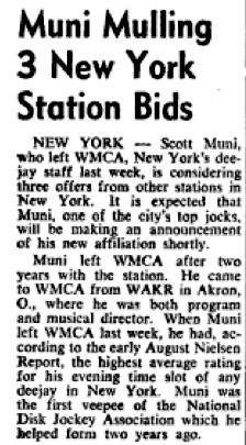 In retrospect, considering that Muni stayed at WNEW-FM for over 30 years, it's hard to believe that his tenures at both WMCA and WABC were relatively short. Obviously, we know that one of the offers was from WABC. One was probably from WINS. But assuming this wasn't just hype, who was the third station offering Muni a job?